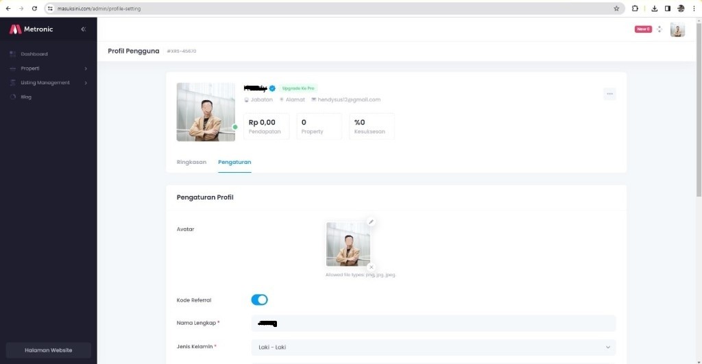 Login dengan akun Anda, lalu pilih Profil. Setelah itu, klik Pengaturan/ubah profil. Disana Anda harus mengaktifkan Kode Referal agar bisa share listing orang lain dengan kontak Anda. Lalu jangan lupa untuk Simpan setingan Anda.