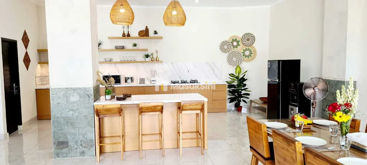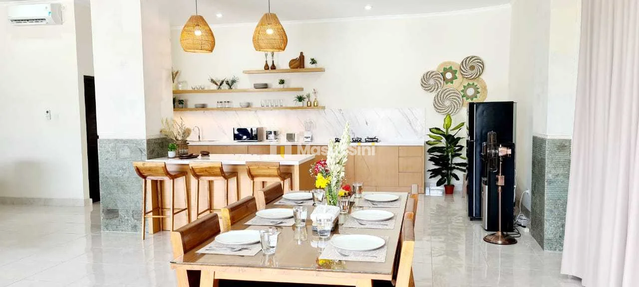 With 7700-watt electricity, PDAM water supply, and an additional water tank, this north-facing villa is fully furnished and ready for occupancy. Annual rent is IDR 748 million, with a 6-month rental option for IDR 403 million. A security deposit of IDR 55 million is required for a one-year lease. Tenants are responsible for electricity expenses, while a staff member living in a separate area at the back ensures comfort and privacy for residents.